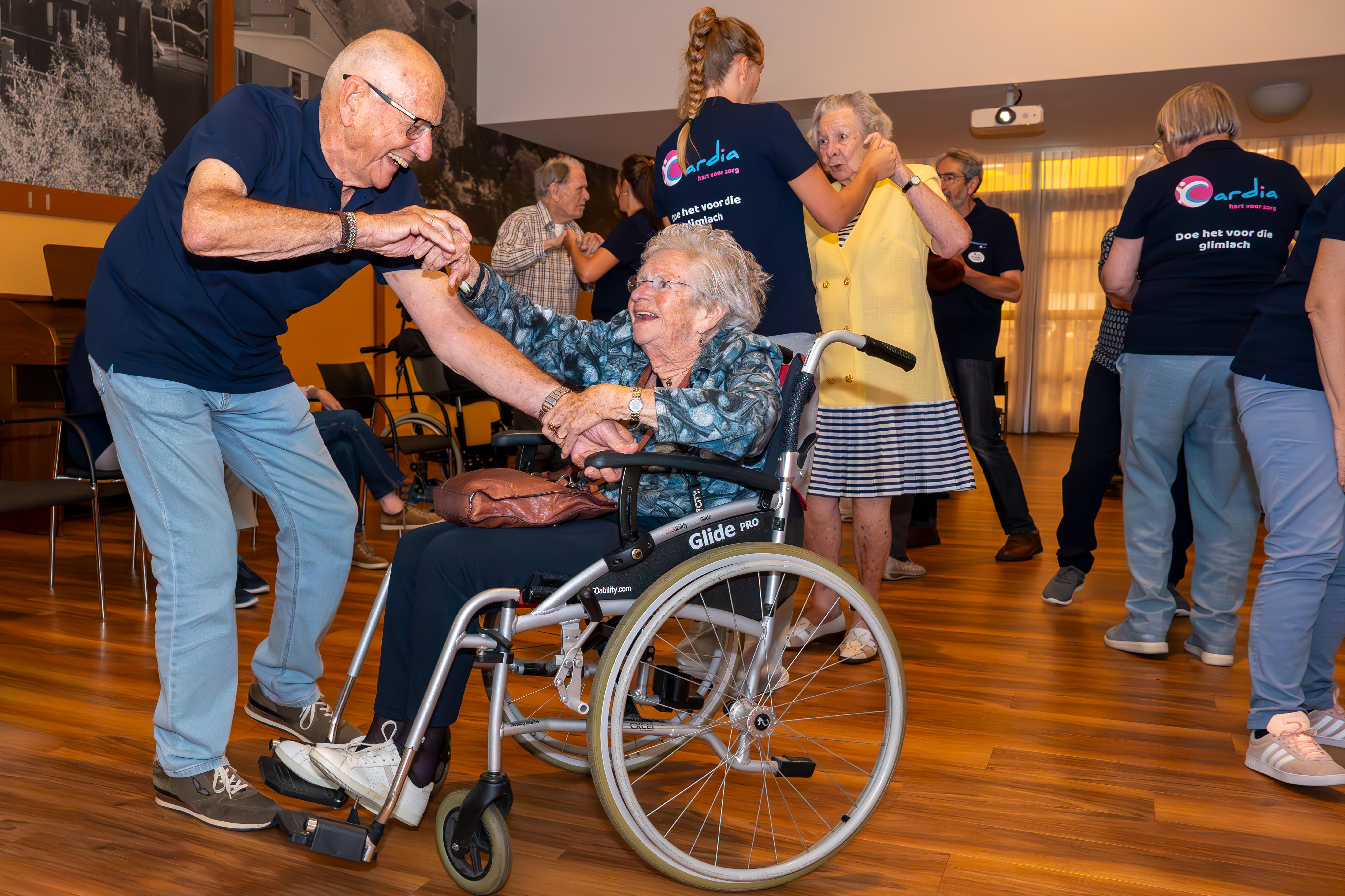 De vrijwilligers bij Cardia Onderwatershof vormen samen met de medewerkers een zeer gemotiveerde groep mensen. Die motivatie wordt zichtbaar uitgedrukt op het T-shirt: ‘Doe het voor die glimlach.’ En die glimlach is er bij de bewoners en deelnemers aan de ‘Dans en Muziek’ activiteit. Het zijn de vrijwilligers die de ondersteuning bieden om dit mogelijk te maken. “Wat fijn dat u mij ten dans vraagt”.